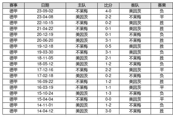 美因茨 VS 不莱梅两队近10年的交战次数为18场,美因茨7胜4平7负,赢球概率为38.9%,平局概率为22.2%,输球概率为38.9%。