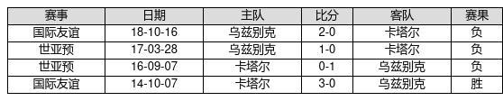 卡塔尔 VS 乌兹别克两队近10年的交战次数为4场,卡塔尔1胜0平3负,赢球概率为25%,平局概率为0%,输球概率为75%。