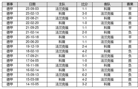 科隆 VS 法兰克福两队近10年的交战次数为17场,科隆6胜5平6负,赢球概率为35.3%,平局概率为29.4%,输球概率为35.3%。