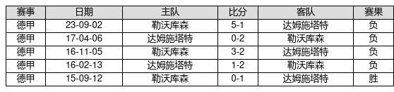 达姆施塔特 VS 勒沃库森两队近10年的交战次数为5场,达姆施塔特1胜0平4负,赢球概率为20%,平局概率为0%,输球概率为80%。