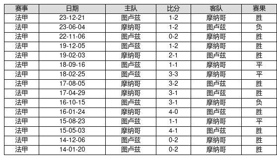 摩纳哥 VS 图卢兹两队近10年的交战次数为15场,摩纳哥10胜3平2负,赢球概率为66.7%,平局概率为20%,输球概率为13.3%。