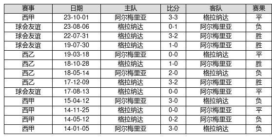 格拉纳达 VS 阿尔梅里亚两队近10年的交战次数为13场,格拉纳达4胜4平5负,赢球概率为30.8%,平局概率为30.8%,输球概率为38.5%。