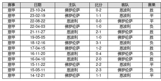 恩波利 VS 佛罗伦萨两队近10年的交战次数为13场,恩波利5胜4平4负,赢球概率为38.5%,平局概率为30.8%,输球概率为30.8%。