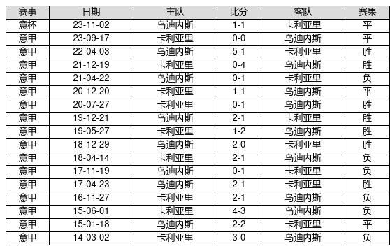 乌迪内斯 VS 卡利亚里两队近10年的交战次数为17场,乌迪内斯7胜4平6负,赢球概率为41.2%,平局概率为23.5%,输球概率为35.3%。