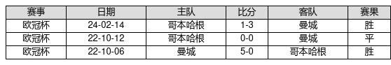 曼城 VS 哥本哈根两队近10年的交战次数为3场,曼城2胜1平0负,赢球概率为66.7%,平局概率为33.3%,输球概率为0%。