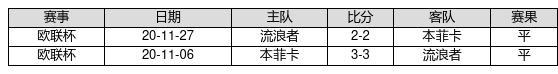 本菲卡 VS 流浪者两队近10年的交战次数为2场,本菲卡0胜2平0负,赢球概率为0%,平局概率为100%,输球概率为0%。