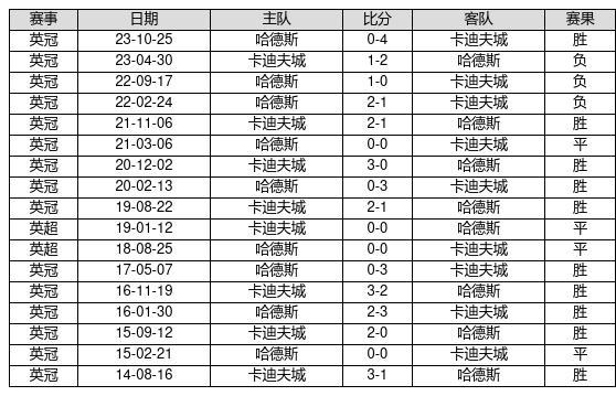 卡迪夫城 VS 哈德斯两队近10年的交战次数为17场,卡迪夫城10胜4平3负,赢球概率为58.8%,平局概率为23.5%,输球概率为17.6%。