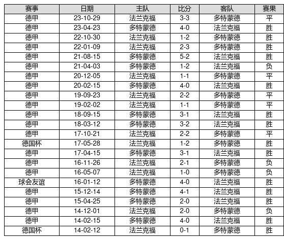多特蒙德 VS 法兰克福两队近10年的交战次数为23场,多特蒙德14胜5平4负,赢球概率为60.9%,平局概率为21.7%,输球概率为17.4%。