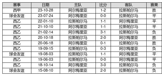 拉斯帕尔马 VS 阿尔梅里亚两队近10年的交战次数为12场,拉斯帕尔马3胜5平4负,赢球概率为25%,平局概率为41.7%,输球概率为33.3%。