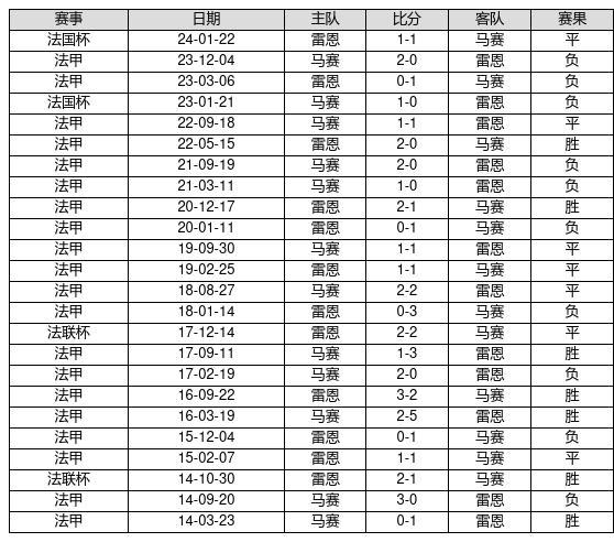 雷恩 VS 马赛两队近10年的交战次数为24场,雷恩7胜7平10负,赢球概率为29.2%,平局概率为29.2%,输球概率为41.7%。