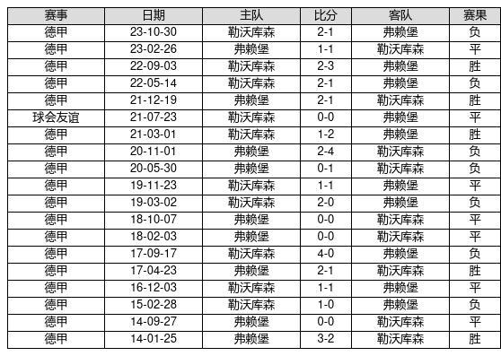 弗赖堡 VS 勒沃库森两队近10年的交战次数为19场,弗赖堡5胜7平7负,赢球概率为26.3%,平局概率为36.8%,输球概率为36.8%。