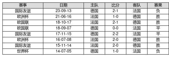 法国 VS 德国两队近10年的交战次数为8场,法国4胜2平2负,赢球概率为50%,平局概率为25%,输球概率为25%。