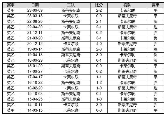 卡莱尔联 VS 斯蒂夫尼奇两队近10年的交战次数为19场,卡莱尔联8胜5平6负,赢球概率为42.1%,平局概率为26.3%,输球概率为31.6%。