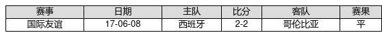 西班牙 VS 哥伦比亚两队近10年的交战次数为1场,西班牙0胜1平0负,赢球概率为0%,平局概率为100%,输球概率为0%。