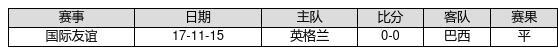 英格兰 VS 巴西两队近10年的交战次数为1场,英格兰0胜1平0负,赢球概率为0%,平局概率为100%,输球概率为0%。