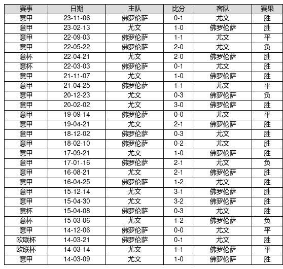 尤文 VS 佛罗伦萨两队近10年的交战次数为26场,尤文17胜5平4负,赢球概率为65.4%,平局概率为19.2%,输球概率为15.4%。
