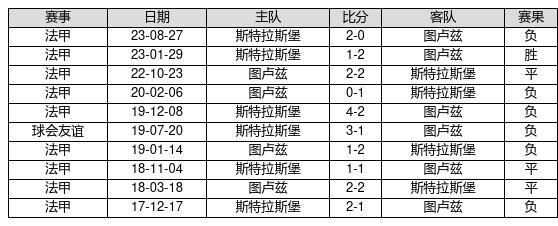 图卢兹 VS 斯特拉斯堡两队近10年的交战次数为10场,图卢兹1胜3平6负,赢球概率为10%,平局概率为30%,输球概率为60%。