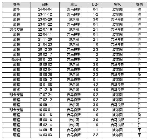 波尔图 VS 吉马良斯两队近10年的交战次数为26场,波尔图21胜3平2负,赢球概率为80.8%,平局概率为11.5%,输球概率为7.7%。