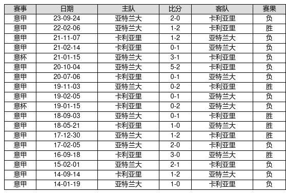 卡利亚里 VS 亚特兰大两队近10年的交战次数为18场,卡利亚里6胜0平12负,赢球概率为33.3%,平局概率为0%,输球概率为66.7%。