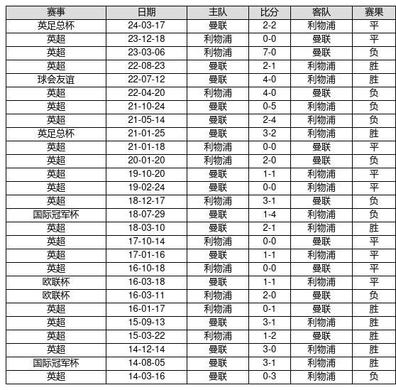 曼联 VS 利物浦两队近10年的交战次数为27场,曼联9胜9平9负,赢球概率为33.3%,平局概率为33.3%,输球概率为33.3%。