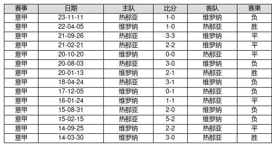 维罗纳 VS 热那亚两队近10年的交战次数为14场,维罗纳3胜5平6负,赢球概率为21.4%,平局概率为35.7%,输球概率为42.9%。
