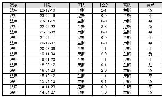 兰斯 VS 尼斯两队近10年的交战次数为16场,兰斯1胜9平6负,赢球概率为6.3%,平局概率为56.3%,输球概率为37.5%。