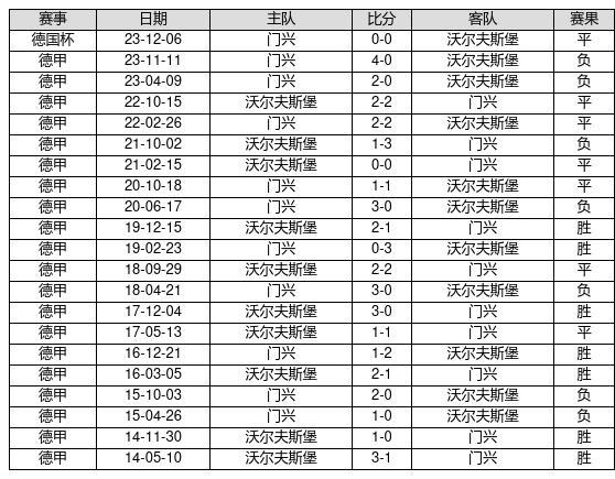 沃尔夫斯堡 VS 门兴两队近10年的交战次数为21场,沃尔夫斯堡7胜7平7负,赢球概率为33.3%,平局概率为33.3%,输球概率为33.3%。
