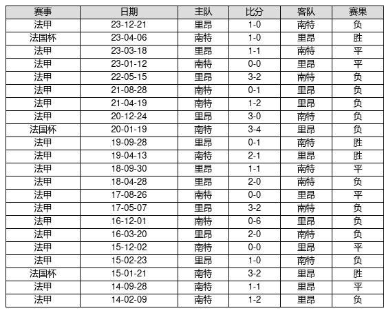 南特 VS 里昂两队近10年的交战次数为22场,南特4胜6平12负,赢球概率为18.2%,平局概率为27.3%,输球概率为54.5%。