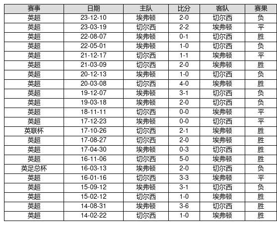 切尔西 VS 埃弗顿两队近10年的交战次数为22场,切尔西10胜5平7负,赢球概率为45.5%,平局概率为22.7%,输球概率为31.8%。