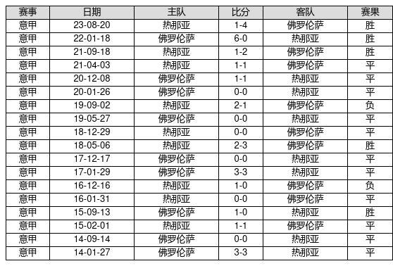 佛罗伦萨 VS 热那亚两队近10年的交战次数为18场,佛罗伦萨5胜11平2负,赢球概率为27.8%,平局概率为61.1%,输球概率为11.1%。