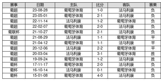 法马利康 VS 葡萄牙体育两队近10年的交战次数为13场,法马利康2胜3平8负,赢球概率为15.4%,平局概率为23.1%,输球概率为61.5%。