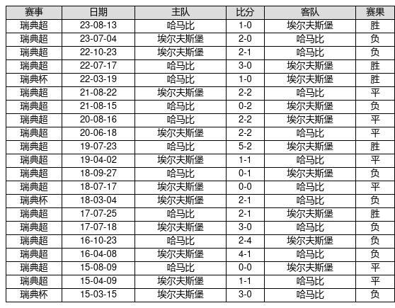 哈马比 VS 埃尔夫斯堡两队近10年的交战次数为21场,哈马比5胜7平9负,赢球概率为23.8%,平局概率为33.3%,输球概率为42.9%。