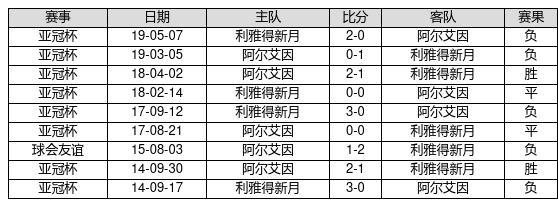 阿尔艾因 VS 利雅得新月两队近10年的交战次数为9场,阿尔艾因2胜2平5负,赢球概率为22.2%,平局概率为22.2%,输球概率为55.6%。
