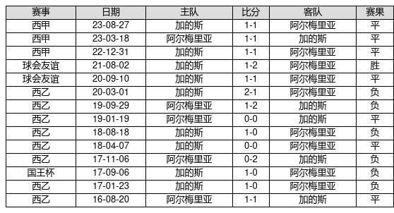 阿尔梅里亚 VS 加的斯两队近10年的交战次数为14场,阿尔梅里亚1胜7平6负,赢球概率为7.1%,平局概率为50%,输球概率为42.9%。