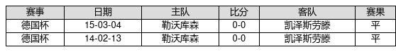 凯泽斯劳滕 VS 勒沃库森两队近10年的交战次数为2场,凯泽斯劳滕0胜2平0负,赢球概率为0%,平局概率为100%,输球概率为0%。