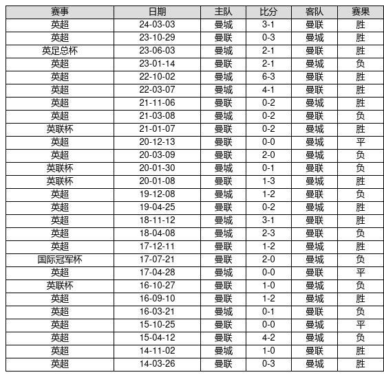 曼城 VS 曼联两队近10年的交战次数为27场,曼城14胜3平10负,赢球概率为51.9%,平局概率为11.1%,输球概率为37%。