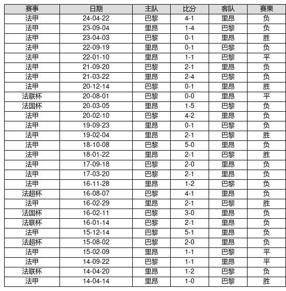 里昂 VS 巴黎两队近10年的交战次数为28场,里昂6胜4平18负,赢球概率为21.4%,平局概率为14.3%,输球概率为64.3%。