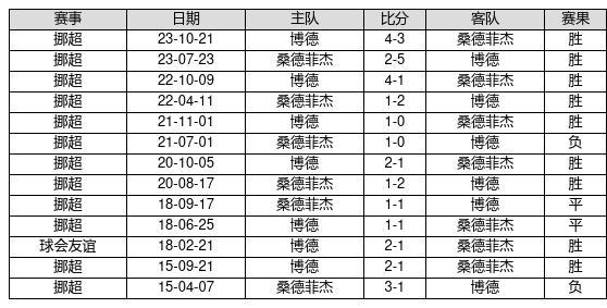 博德 VS 桑德菲杰两队近10年的交战次数为13场,博德9胜2平2负,赢球概率为69.2%,平局概率为15.4%,输球概率为15.4%。