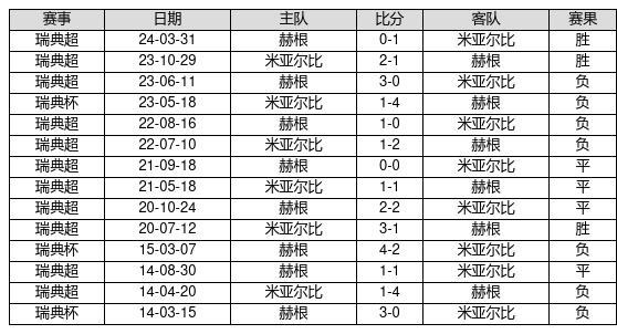米亚尔比 VS 赫根两队近10年的交战次数为14场,米亚尔比3胜4平7负,赢球概率为21.4%,平局概率为28.6%,输球概率为50%。