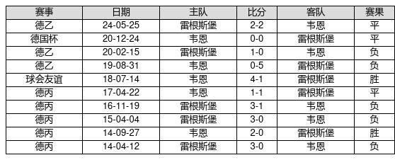 韦恩 VS 雷根斯堡两队近10年的交战次数为10场,韦恩2胜3平5负,赢球概率为20%,平局概率为30%,输球概率为50%。