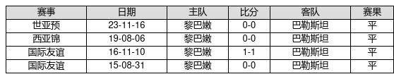 巴勒斯坦 VS 黎巴嫩两队近10年的交战次数为4场,巴勒斯坦0胜4平0负,赢球概率为0.0%,平局概率为100.0%,输球概率为0.0%。