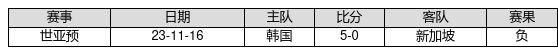 新加坡 VS 韩国两队近10年的交战次数为1场,新加坡0胜0平1负,赢球概率为0.0%,平局概率为0.0%,输球概率为100.0%。