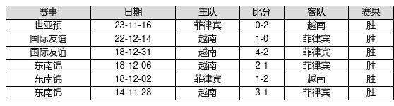 越南 VS 菲律宾两队近10年的交战次数为6场,越南6胜0平0负,赢球概率为100.0%,平局概率为0.0%,输球概率为0.0%。
