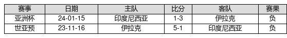 印度尼西亚 VS 伊拉克两队近10年的交战次数为2场,印度尼西亚0胜0平2负,赢球概率为0.0%,平局概率为0.0%,输球概率为100.0%。