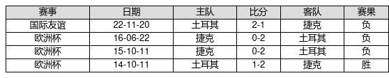 捷克 VS 土耳其两队近10年的交战次数为4场,捷克1胜0平3负,赢球概率为25%,平局概率为0%,输球概率为75%。