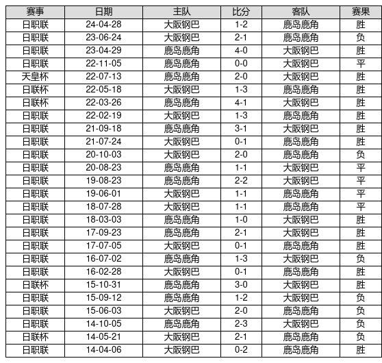 鹿岛鹿角 VS 大阪钢巴两队近10年的交战次数为26场,鹿岛鹿角14胜5平7负,赢球概率为53.8%,平局概率为19.2%,输球概率为26.9%。
