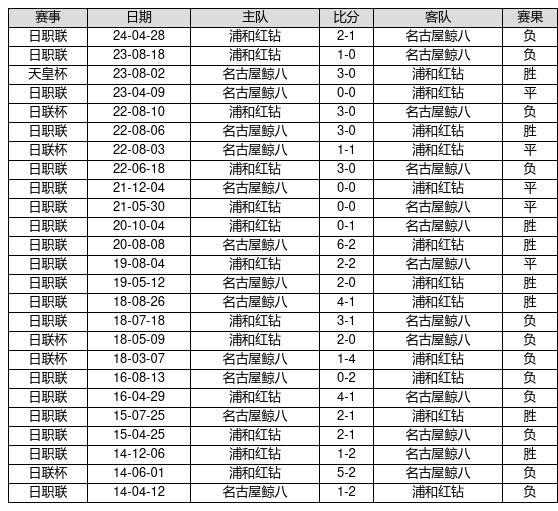 名古屋鲸八 VS 浦和红钻两队近10年的交战次数为25场,名古屋鲸八8胜5平12负,赢球概率为32%,平局概率为20%,输球概率为48%。