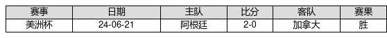 阿根廷 VS 加拿大两队近10年的交战次数为1场,阿根廷1胜0平0负,赢球概率为100.0%,平局概率为0.0%,输球概率为0.0%。