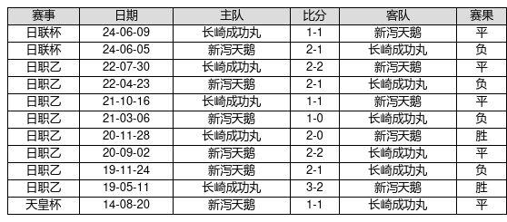 长崎成功丸 VS 新泻天鹅两队近10年的交战次数为11场,长崎成功丸2胜5平4负,赢球概率为18.2%,平局概率为45.5%,输球概率为36.4%。