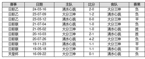 大分三神 VS 清水心跳两队近10年的交战次数为10场,大分三神2胜3平5负,赢球概率为20.0%,平局概率为30.0%,输球概率为50.0%。